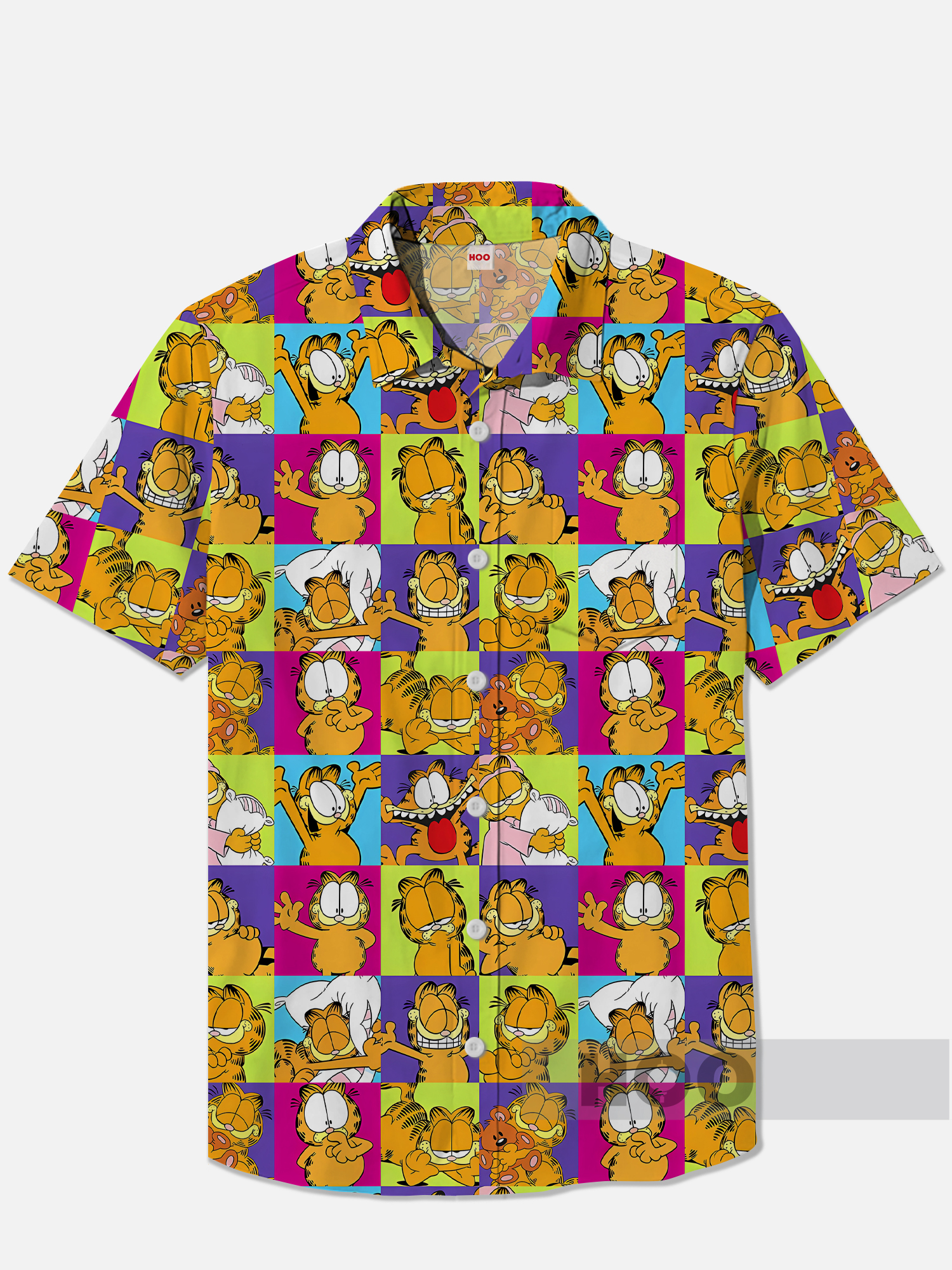 Nostalgic Anime Color Blocks Anime Pet Cats Printing Breast Pocket Hawaii Shirt