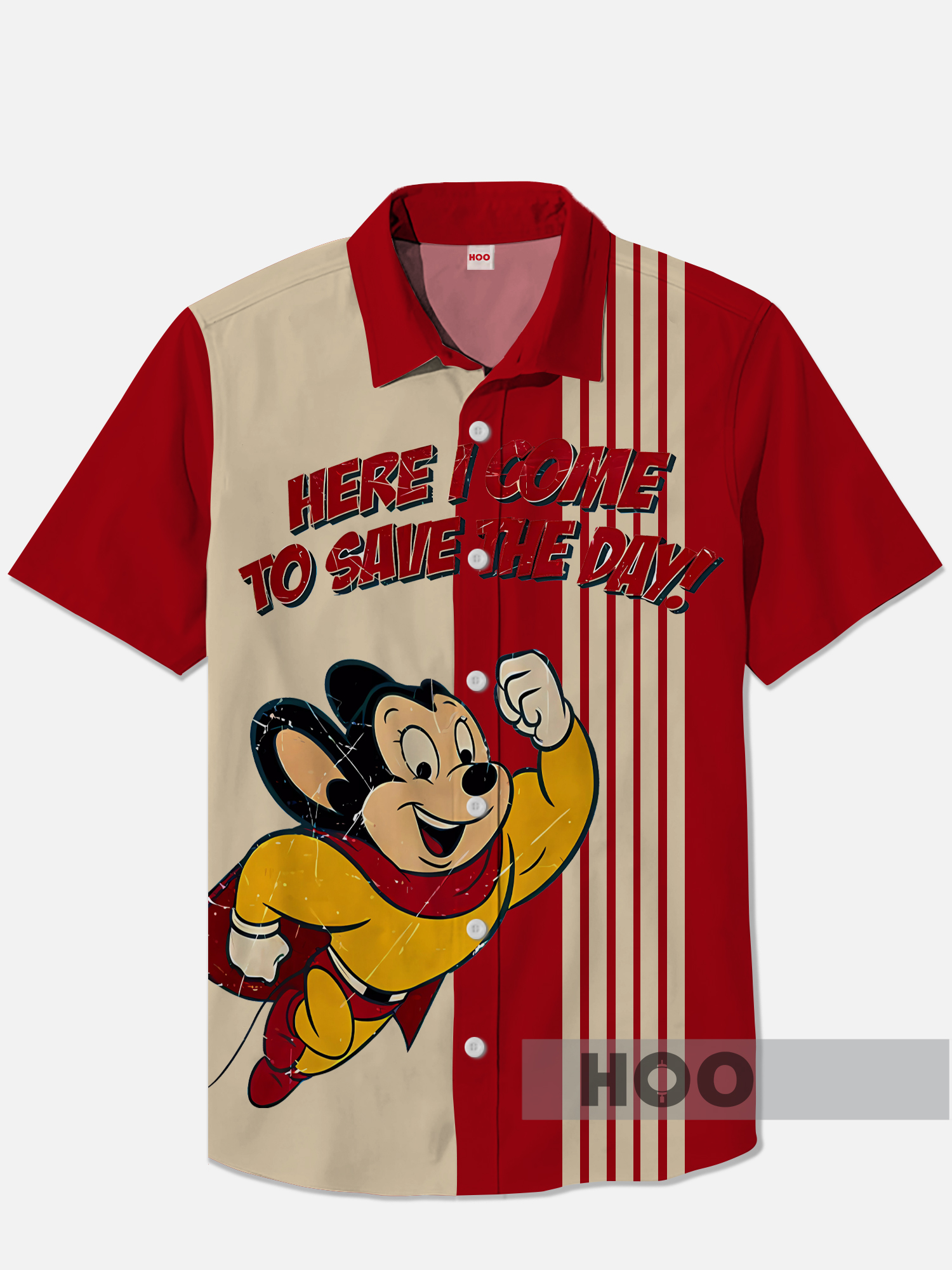Nostalgic Cartoon Red And Khaki Stitching Super Mouse Printing Hawaii Shirt