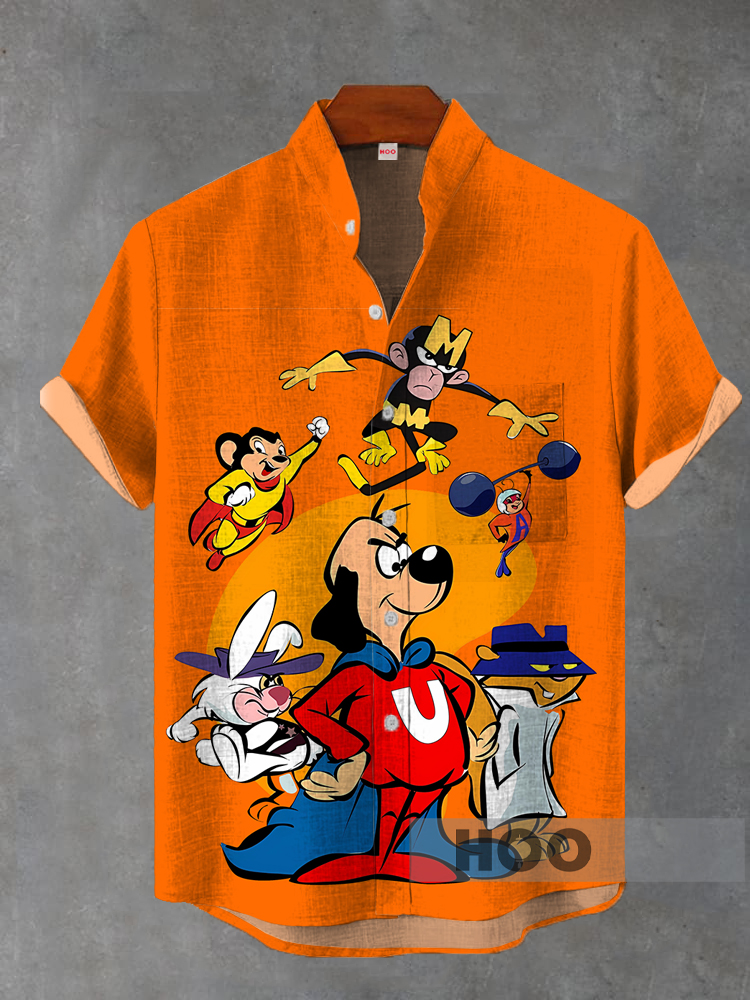 Orange Nostalgic Anime Super Power Anime Characters Printing Breast Pocket Hawaii Shirt